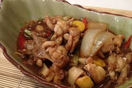 1. 牛蛙切块,用盐半茶匙,食用油半汤匙,黑胡椒半茶匙,干淀粉两茶匙用手抓拌均匀,腌渍十分钟。