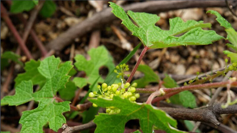 ②刺葡萄,又名:千斤藤、山葡萄。落叶藤本。枝条粗壮,黄褐色,无毛,老枝外皮成长片剥落,淡褐色,