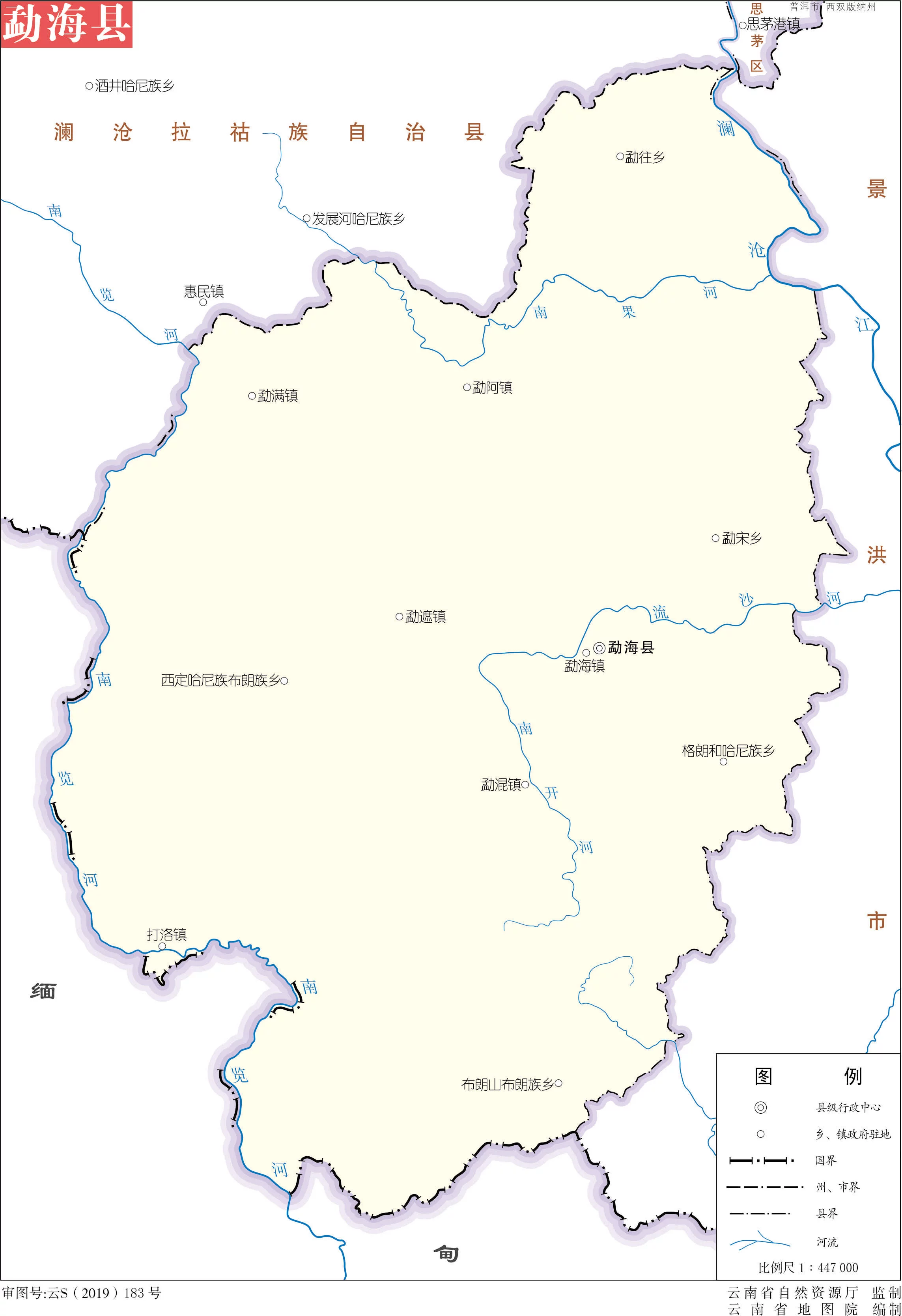 2013年,勐海县辖6镇5乡,即勐海镇、打洛镇、勐遮镇、勐混镇、勐来自满镇、勐阿镇、勐宋乡什益影各优三冷仍律药、勐往乡、格朗和哈尼族乡、布朗山布朗族乡、西定哈尼族布朗族乡。全县11个乡镇下辖4个社居民员会、85个村民委员会、360百科937个村民小组、888个自然村。