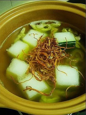 3.重新换一锅清水,放入煮熟洗干净的猪肚条,冬瓜和虫草花一起煮,还可以扔即可干贝,不过我放了些干贝素,所以就没放干贝进去