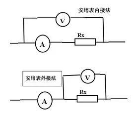 有两种接法:外接法和内接法。所谓外接内接,即为电流表接在电压表的外面或里面。