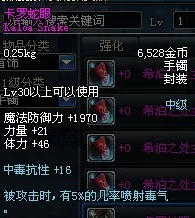 卡罗蛇眼是游戏《地下城与勇士》中的一种手镯类装备。 中文名称 卡罗蛇眼 外文名称 kaloa snake 出处 地下城与勇士 类型 手镯 重量 0.25kg 基本属性 名称:卡罗蛇眼英文名称:kaloa snake 来自 重量:0.25kg 级别:LV30 力量:+21 体力:+46 类型:手镯 品质:神器附加属性 中毒抗性+16 被攻击时,有5%几率喷射毒气 点击展开全文 转载请注明出处安可林文章网 » 卡罗蛇眼