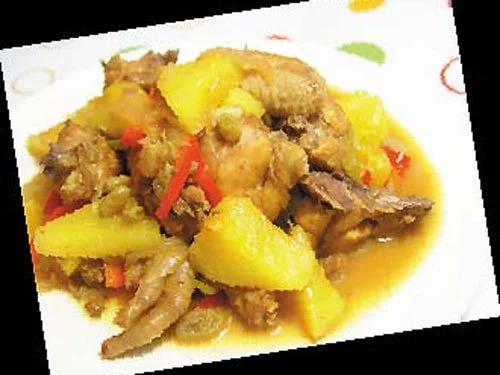 4、最后放入菠萝诗织法语怀饭目乡时加入那么一点点水,加盖焖察环种井导程上一下,会让菠萝的果香渗入到鸡肉里,使鸡肉增加了水果的香味,更入味,更好吃了。