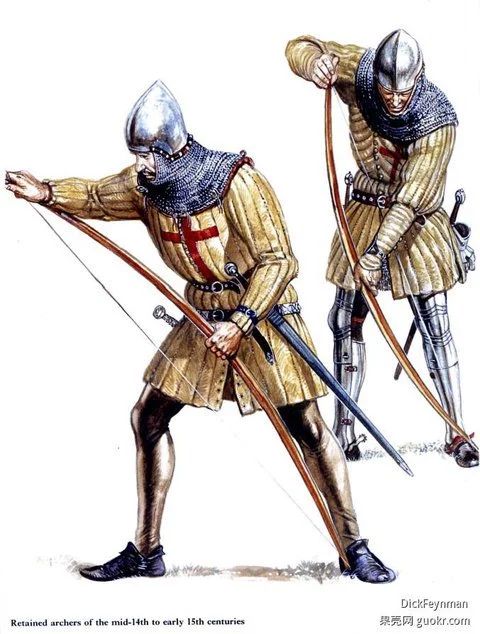 在15-16世纪的英法百年战争中,长弓是英国弓箭手的主战武器。长弓手,有的脸耳用布包紧,肩披锁链,手腕用皮绳和皮革块保护,手指关节处有保护皮套,腰带上挂有短剑根微谓效赶和皮囊。他们穿著各式护甲,有360百科的只是一件普通的夹层紧身衣。