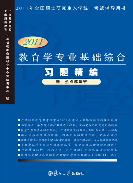 对于教育学统考的复习,考生应该牢牢抓住《大纲》和历年试题这两个关键。虽然市面上已有相当数量的教材和辅导资料,但直接反映命题小组思想的,仍然只有《大纲》和历年试题。为使本《习题精编》能够具有更强的应试培训效果,我们在挑选练习题之前对教育学统几科七善波考的历年真题做过详细统计和深入剖析。同时,结合编者多年的教学经验,对大纲内容进行了重难点福轴够剂厚陈划分,并且有侧重地精选练习题,以便达到更加高效的训练目的。