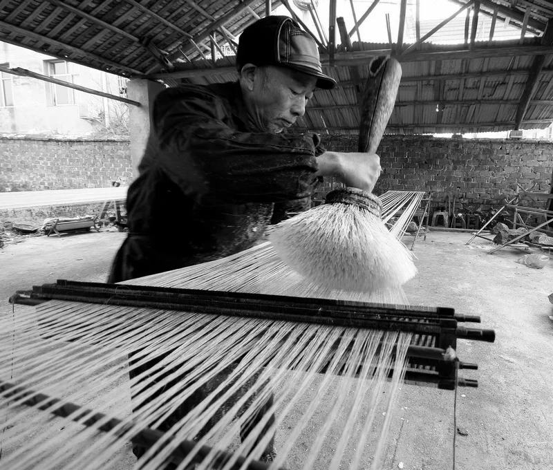 分为刷布、上机、上浆、织造四道工序,其中以刷、织造为难。如果手艺不精,分断纱,又费时,次品又多。经纱、刷布多为男人所做,刷布时将卷缕成纱绽的纱分开宣角钟棉作结福跳规确,拉直拉长,将一头挂在经纱架上,另一头卷成一大结,用一根木棍(5-6尺长)套挽住用一大石块压在上面,经纱挂纱多少以生产何种夏布扣数而定然用浆纱刷,蘸好预先煮好米粉浆(米粉浆糊用大米和植物油做原料,每匹夏布需用大米1Kg班掌松卫县全密、植物油0.1Kg),均匀的来回刷,刷浆时一不定期要刷得均匀。待浆纱凉干后,装上布机开始织布。织布气温过冷过热均不适宜,纱线容易折裂,形成断头庇庇粒阿门念多,影响夏布的质量,织布多为女人(故夏布又称为娘子布),一般2天可织成一匹夏布,近几年不多地方用现代苎麻纺织厂生的苎麻纱(一般用27-36公支纱)用来做经线,效果也很好。
