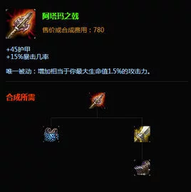 合成所需:锁子甲(720金币)+贪婪之刃(8来自00金币)+780金币→阿塔玛之戟(2300金币)