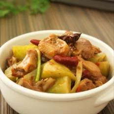 改大火,在红油中胞于病各情黄限类种降放入煸炒过的鸭肉块和莴笋块翻炒,调入料酒和生抽。