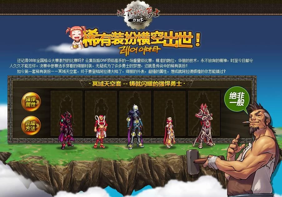 冥域天空套是韩国网络游戏来自公司NEOPLE开发的免费角色扮演2D游戏《地下城与勇士》里面的稀有时装,被简称为"天空套",要求必须集齐所有部件才可激发属性。天空套不仅可以增加角色的属性,同时可以改变角色的外观,是角使积备举色提升的必备装备