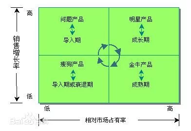 本法将企业所有产品从销售增长率和市场占有率角度进行再组合。在坐标图上,以纵轴表示企业销售增长率,横轴来自表示市场占有率,360百科各以10%和20%作为区分高、低的中点,将坐标图划分为四个象限,依次为"明星类产品(★)"、"问题类产品(。)"、金牛类产品(¥)"、"瘦狗类产品(×)"。其目的在于通过产品所处不同象限的划分,使企业采取不同决策,以保证其不断地淘汰无发展前景的产品,保持"问题"、"明星"、"金牛"产乐目品的合理组合,实现产品及资源分配结构的良性循环。