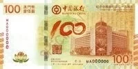 健经营的理念、客户至上的宗旨、诚信为本的质量。纪念文字为"纪念中国银行成立一百周年"。正面中部极具中国书法韵味的数字"100"既是面额,又与百年纪念主题呼应,其中"00"以" ∞"符号表现,寓意中国银行无限广阔的发展前景。颜色采用与现行澳门币1000元券相近的"华彩金"为主色调,体现盛世华诞、百年庆典的祥和氛围。正面采用国际前沿的防伪技术光彩光变莲花图案和动感中国银行行徽安全线,具有很强的防伪性能