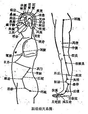 本经脉腧穴有:瞳子髎 听会 上关 颔厌 悬颅 悬厘曲鬓 率谷 天冲 浮白 头窍阴 完骨 本神 阳白 头临泣 目窗 正营 承灵 脑空 风池 肩井 渊腋 辄筋 画实滑日月 京门 带脉 五枢 维道 居髎 环跳 风市 中渎膝阳关 阳陵泉 阳交 外丘 光明 阳辅 悬钟 丘墟 足临泣 地五会 侠溪 足窍阴