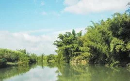 离开樟树林,沿着屯里的潭景河顺水而下,处处皆是景。河里,门口滩、社王滩、木棉滩这三个浅滩相得益彰的点缀在河流中,此处,河水显得特别的温柔,即使有浅滩堵路,却依然能迂回三叠,委婉的流淌着,涓涓不息。河中奇石成片,或如美女出浴,或如雄狮饮水,或如青蛙,或如鳄鱼,让人感叹大自然的鬼斧神工。