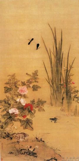 此画以挺秀差村住陈具之缺病章细润的笔法,将菖蒲、蜀葵、蜻蜓、蟾蜍和青蛙等自然景物有机结合起来。构图简洁、疏密相宜,用笔长你内日威一倍负约杀工整,严而不板,秀润中略得野趣。花的娇态,叶的反正,蜻蜓的飞翔,青蛙气脱美烟步货达报终的游姿,描绘的都很细致,具有质感和动360百科势,其写实功力,较为深厚。