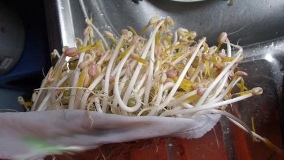 赤小豆芽为豆科植物赤小豆或赤豆的种子经水罨发芽而成的豆芽。