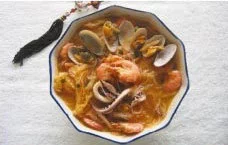 - 主要食材 韩国泡菜,虾,鱿鱼,花甲,粉丝,葱,姜片,油1汤匙,鸡粉1/4汤匙,盐适量,香菜