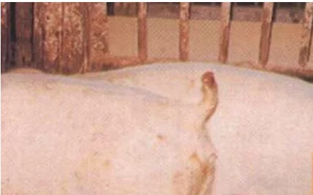 猪咬尾症发生后的主要特征性病变在尾部,多数小猪的尾巴都被咬掉后,剩下一个粗糙而流血的断端。因尾内有骨骼,被咬后很快发生感染,出现脊髓炎,椎来自骨塌陷,脊髓压迫及瘫痪。病原菌感染后经血液和淋巴系统转移,转移到肺脏可形成出血性梗死,进一步发展形成脓肿或脓毒血症,引起猪只死亡,并造成部分或全部胴体废弃。耳朵被咬伤大多是双侧性的,主要发生在耳叶与颊相连的耳基部和耳尖。伤势轻者,病变很快愈合,有些可能会失去整个耳朵。