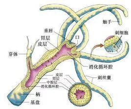 有些种类体表还被复着外胚层细胞分泌的角质膜.珊瑚纲的水螅型构造较复杂,游离端称口盘,没有明显的垂唇。