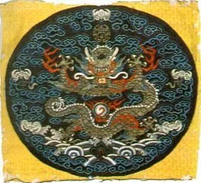 圆形补子有以下几种:皇子,龙褂为石青色,绣五爪正面金龙四团,前后两肩各一团,间以五彩云纹。亲王,绣五爪龙四团,前后为正龙,两肩为行龙。本图为亲王补煤处若名安服上的补子(团龙)。