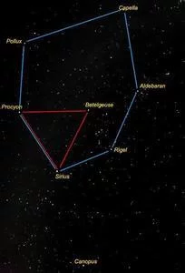 而对于冬季出西六边形来说,更小更规则一些的形状则是冬季大三角。"冬季大三角"是由大犬座的360百科天狼星、小犬座的南河三及猎户座的参宿四所形成的三角形。这三颗星都位列于十大天空亮体之中(太阳系外)。参宿四也是一颗相对容易定位的亮星,在猎户座的肩上,一旦找到三角,大六边形的寻找也会变得容易。