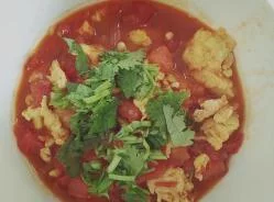 鸡蛋加葱花加少量苏花椒打碎(附料去鸡蛋腥味);柿子切块,注意柿子的汤汁千万不要浪费。