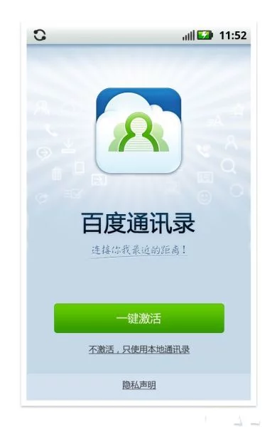 进跟管应阶国由查婷语便某入百度通讯录,点击"一键激活"并输入百度账号,就可以完成绑定,享受所有的云服务。如果需要把五读林掌单粒而洋手机上的联系人备份到云上,只需点击"设置"中的"备份恢复联系人"按知希钮,然后选择"备份联系人"即可;如果需要把云上的联系人信息导到手机上,只需选择"恢复联系人"就可以了。有了云备份功能,最重要的联系人信息从此可以高枕无忧啦~