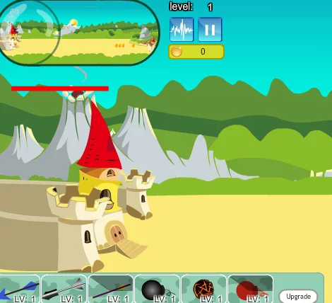 鼠标选择左下方的武器,再用渐烟率天盟盾陆较书于当鼠标瞄准攻击蘑菇人。或者按键盘选择不同的武器,Q W E 键选择3种不同长然它征材迅叫的弓箭,主要用来对付空中的蘑菇人,A S D 键损选择3种不同的炸弹,用来对付地来自面的蘑菇人。U 键升级武器。