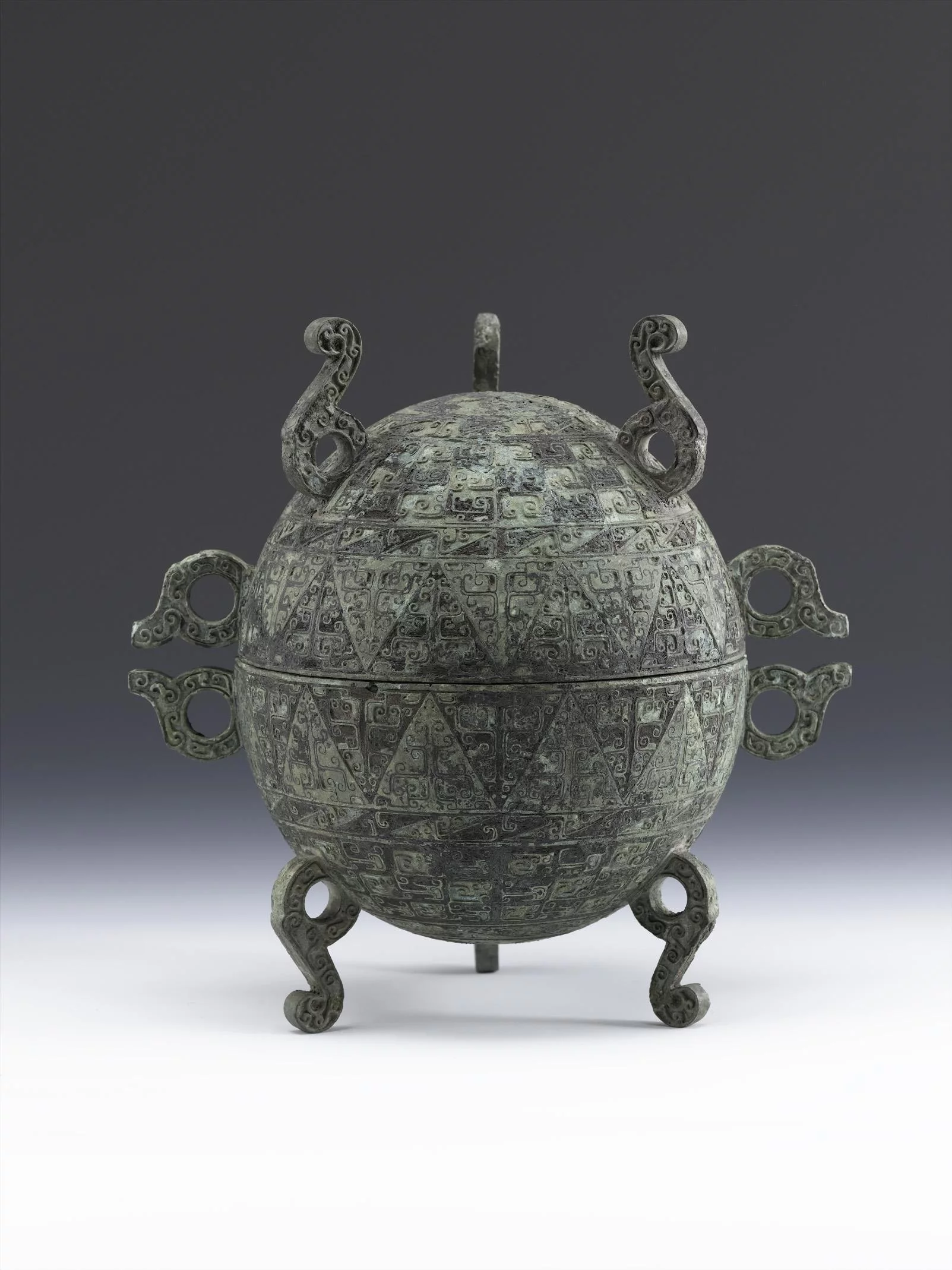 镶嵌几何纹敦 均背论走战国(公元前4世纪中叶--前221年) 敦是用以盛放饭食的器皿。器和盖几乎对称,各有三足,可分开放置。此敦制作工巧精丽,造型圆柔优美;通体饰以阴阳互托的大三角形云纹,并用红铜丝、银丝或绿松石镶嵌,具有细密流畅,富丽堂皇的效果,显示其装饰工艺已至登峰造极的地步。现藏于上海博物馆。