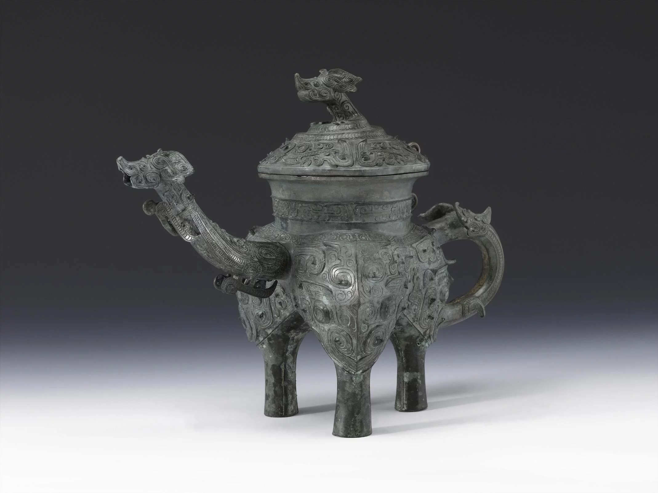 春秋中期(公元前7世纪上半叶--前6世纪上半叶) 盉为调酒器。来自此盉呈钝三角形,长流作龙形360百科,以张开的龙口为流口;盖顶是一个盘旋而出的龙头,与流口的龙头层叠趋前,呈双龙继起的姿态。这是春秋中期南方的越族人模仿西周盉并加以创造的杰作。现藏于上海博物馆。