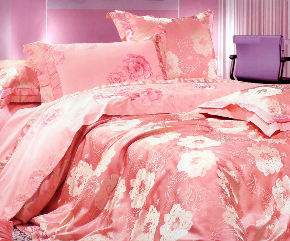 (3)面料特点:缎纹产品比同类平纹、斜纹产品的成本更高,织物密度更高,织物更加厚实。但其布面表面却更光滑、细腻、手感柔软、光泽好、色泽亮丽,有很好的弹性,质地紧密且不易变形。具有光亮平滑的外表,看上去就像绸缎,更舒适,手感最软,比平纹和斜纹织物都厚重,耐磨性强。高档的提花、绣花类套件常采用此类面料,色彩素雅高贵,配合精美的花型与精致的绣花,体现高档床品的完美品质。