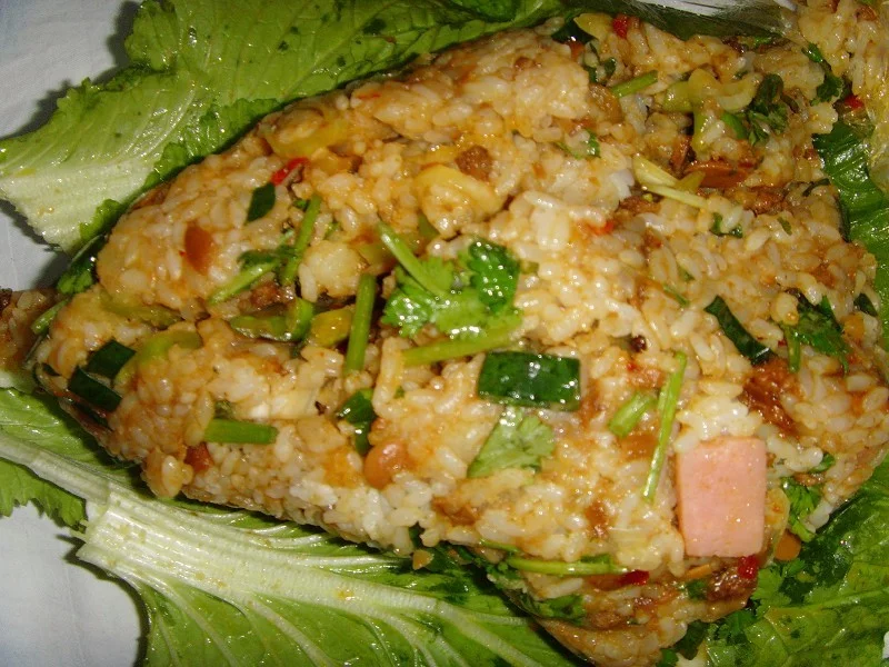 5把饭拌匀后,另拿一碗,铺好控干的生菜叶,把饭放到里面,包起就能吃了。省事,还不用做别的菜。很香。