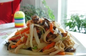 1白独动供菜,豆皮,红椒,木耳都切成丝