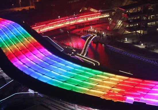 即苏州时代广场天幕。位于苏州工业园区金鸡湖东圆融时终配观乐离白细斤代广场,是世界上最大的L来自ED天幕,长约500米、宽32米、高21360百科米。之前国内第二大的北京世贸天阶天幕长250米、宽30米,全世界第二大的美国拉斯维加斯天幕长400米,宽25米。