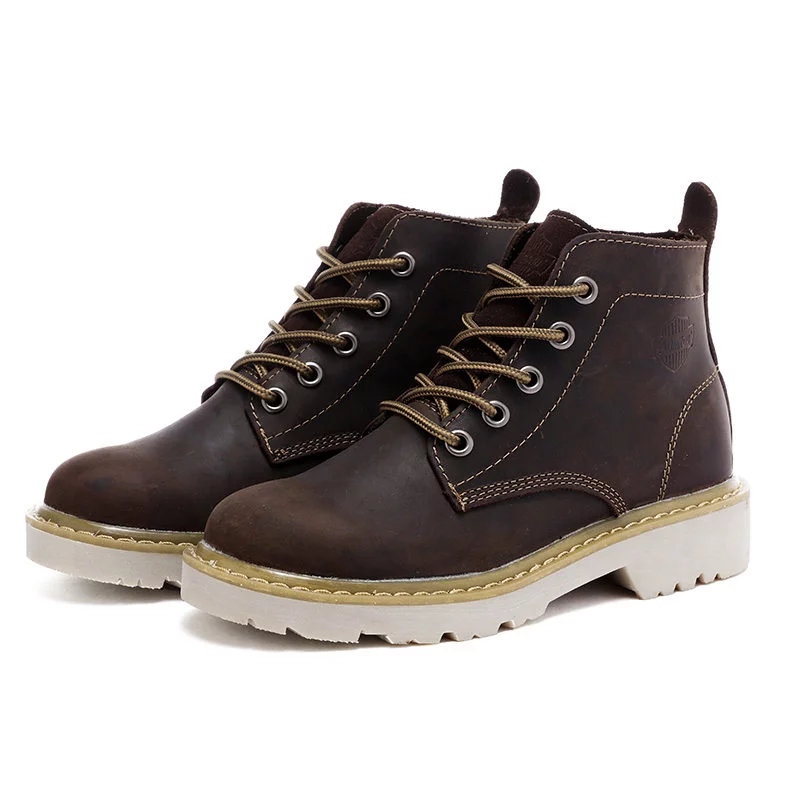 工装靴产品造型分为高帮,低帮两类,工艺结实,鞋面多为牛皮,反绒皮材料。鞋底厚实,制造技术为牛筋底,橡胶等。