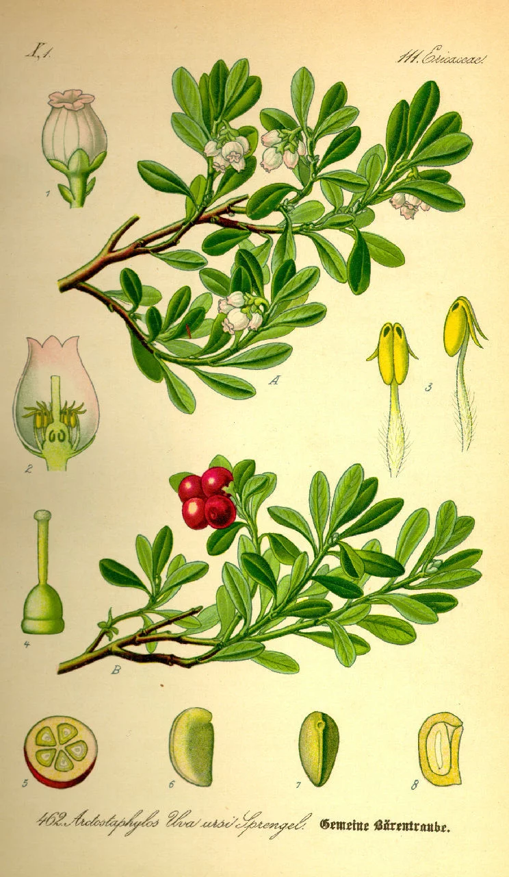 含熊果酚甙、熊果素,熊果酸、洋梨甙、毛柳甙、4-羟苯基、β-龙胆二糖甙、