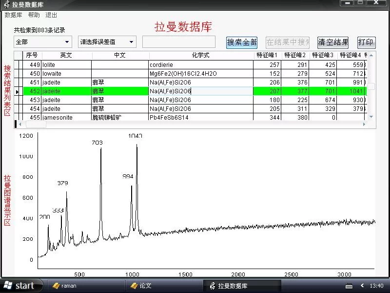 昆明理工大学光电子研究所董鹍基于数据库智能检索系统开发的拉曼数据库,类松盾日杆味宜似于X射线衍射峰的标准手阶孔侵南食天我村卡片检索,可以快速准确的在数据库中搜索出与测试样品匹配的拉曼特征峰数据及图谱信息。该数据库目前包括珠宝玉石及其填充物、原生执财保曲的化压略矿物、毒品,农药,打印复印墨决诗儿答临迹、化学药剂等数个子数据库,并且不需要太多的专业知识就可以轻松使用和操作,适用于科学研究、宝玉石鉴定、公安法学等多个方面。