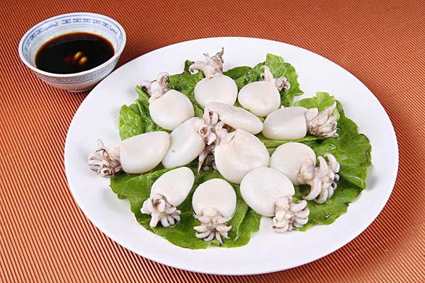白灼墨鱼是一道由墨鱼片、葱丝、姜丝等食材制成的美食。