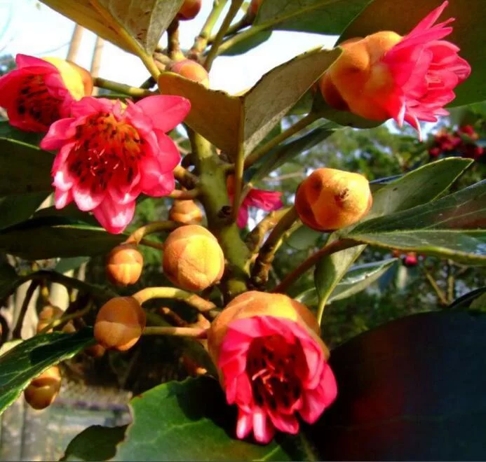 红花荷(学名:Rhodoleia championii Hook. f.)金缕梅科红花荷属常绿乔木,高可达12米,嫩枝颇粗壮,叶厚革质,卵形,光滑无毛,有三出脉,叶面呈深绿色而略带光泽,叶背呈淡绿色,被一层带蓝色的蜡粉所覆盖,网来自脉不显著,叶柄带红色。头状花序,常弯垂;有鳞状小苞片,总苞片卵圆形,花瓣匙形,红色;雄蕊与花瓣等长,花丝无毛;子房无毛,头状果序有卵圆形蒴果,种子扁平,黄褐色。3-4月开花。