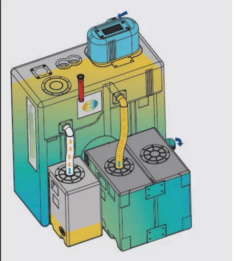 经过比重分离后,油水混合的冷凝液通过腔体下部的管路,进入预过滤器和吸附过滤器,净化后从排出管排出。