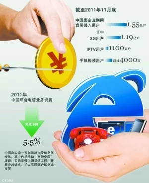 截止2011年11月底,中国固定互联网宽带接入用户为1.55亿户,3G用户1.19亿户,IPTV用户1100万户,手机视频用户超过4000万。2012年,中国综合电信业务资费同比下降5.5%。