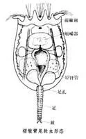 背甲后部正中有一开口,在被面为正方型、腹面为三角形。轮虫尾部即从此孔伸出。