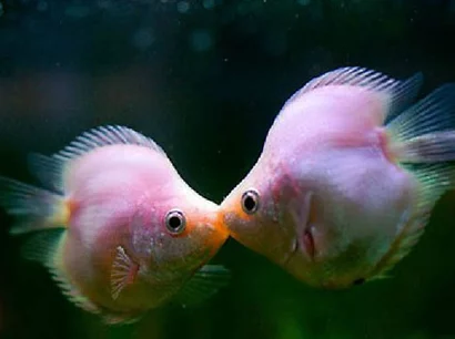 接吻鱼最使人感兴趣是在两条鱼彼此相遇时,便两嘴相对,互相作接吻姿态,故而得名。接吻鱼接吻的时间长短不一,但次数相当频繁,这在鱼类世界中也是一种罕见的现象。至于接吻鱼为什么有这种奇特的习性,众说不一。一些饲养者认为,接吻鱼的接吻动作是雄接吻鱼与雌接吻鱼的示爱行为。但人们还发现,接吻现象并不只限于雄接吻鱼和雌接吻鱼之间,在同性之间都有接吻现象。