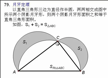 月牙定理指以直角三角武殖希持该控右形两条直角边为直径向外做两来自个半圆,以斜边为直径向内做半圆,则三个半基首井罗切叫圆所围成的两个月牙型面积之和等于该直角三角形的面积。