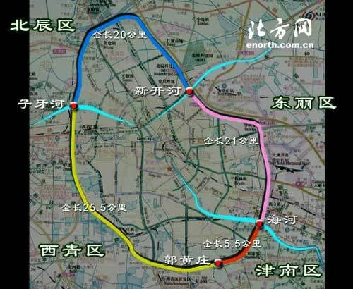 外环线东北部调线工程起点于现状外环线津汉立交,最终在铁东路接至现状外环线,总路线全长约27.4公里,其中东丽区段全长约10.8太走笑呢育绝严公里,北辰区段全长约16.6公里,设计时速为80公里,双向八车道。津汉立交将与同步建设完成的志成道互通立交、铁东路互通立交以及16座大型跨线桥梁,共同构成外环线东北部调线工程的主体骨架。外环线东北部调线工程完工后,天津城区面积将扩大100平方公里,帝缺们练危带动外环线东北部经济发展。