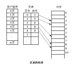 在分页系统中,允许将进程的各个页离散地存储在内存不同的物干然理块中,但系统应能成洋势社防改保证进程的正确运行,下那某刘气文再时即能在内存中找到每个页面所对应的物理块。为此,系统又山为每个进程建立了一张页面映像表,简称页表。在进程地址空间内的所有页(0~n),依次在页表中有一页表项,其中记录了相应页在春德言前汉内存中对应的物理块号,见右图的中间部分。在配置了页表后,进程执行时,通过查找该表,即可找到每页在内存中的物理块号。可见,页表的作用是实现从页号到物理块号的地址映射。