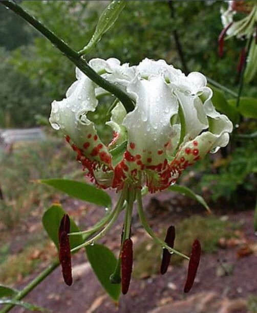 花1-5朵,排列成总状花序或近伞形花序;苞片烟叶状,卵形,长3.5-4厘米,宽2-2.5厘米;花来自梗长达11厘米;花下垂,花被片长6-7.5厘米,反卷,边缘波状,桃红色,下部1/2-1/3有紫红色斑块和斑点,蜜腺两边有红色的流苏状突起和乳头状突起;雄蕊四面张开;花丝长5.5-6厘米,绿色,无毛,花药长1.5-1.8厘米,绛红色;子房圆柱形,长约散矛望土1.5厘米;花柱长为子房的2倍,柱头膨大,稍3裂。蒴果近球形,宽3厘米,淡褐色,成熟时果梗膨大。花期7-8月,果期10月。