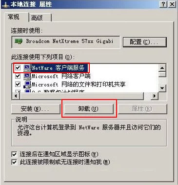 特殊情况在本地连接内没有找到netware客户服务端的可以点添加先安装netware客户服务端,然后再卸载会提示几次重启,点"否"。