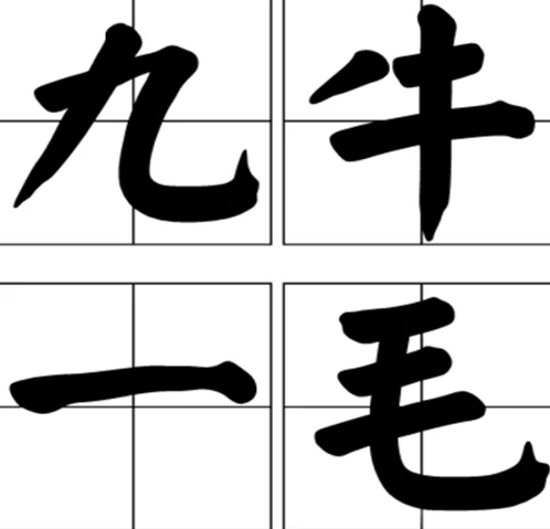 九牛一毛指九头牛身上的一根毛;比喻极大数量中极微小的数量,微不足道。在句中一般作主语、宾语、定语。