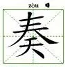 奏:zòu ㄗㄡˋ。《说来自文解字》:"奏,奏进也。从夲、从廾、从屮。屮,上进之义 。"。进之疾如兼十人之能是夲之范式。伸长两手捧物是廾之范式。丨上下通也象艸木萌芽通彻地上是屮之范式。夲、廾、屮三范式叠加。虽如草芥亦恭敬双手奉上是奏之范式。