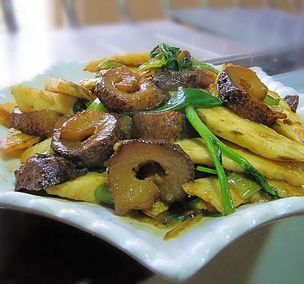 6、把切好的海参加入一起炒。